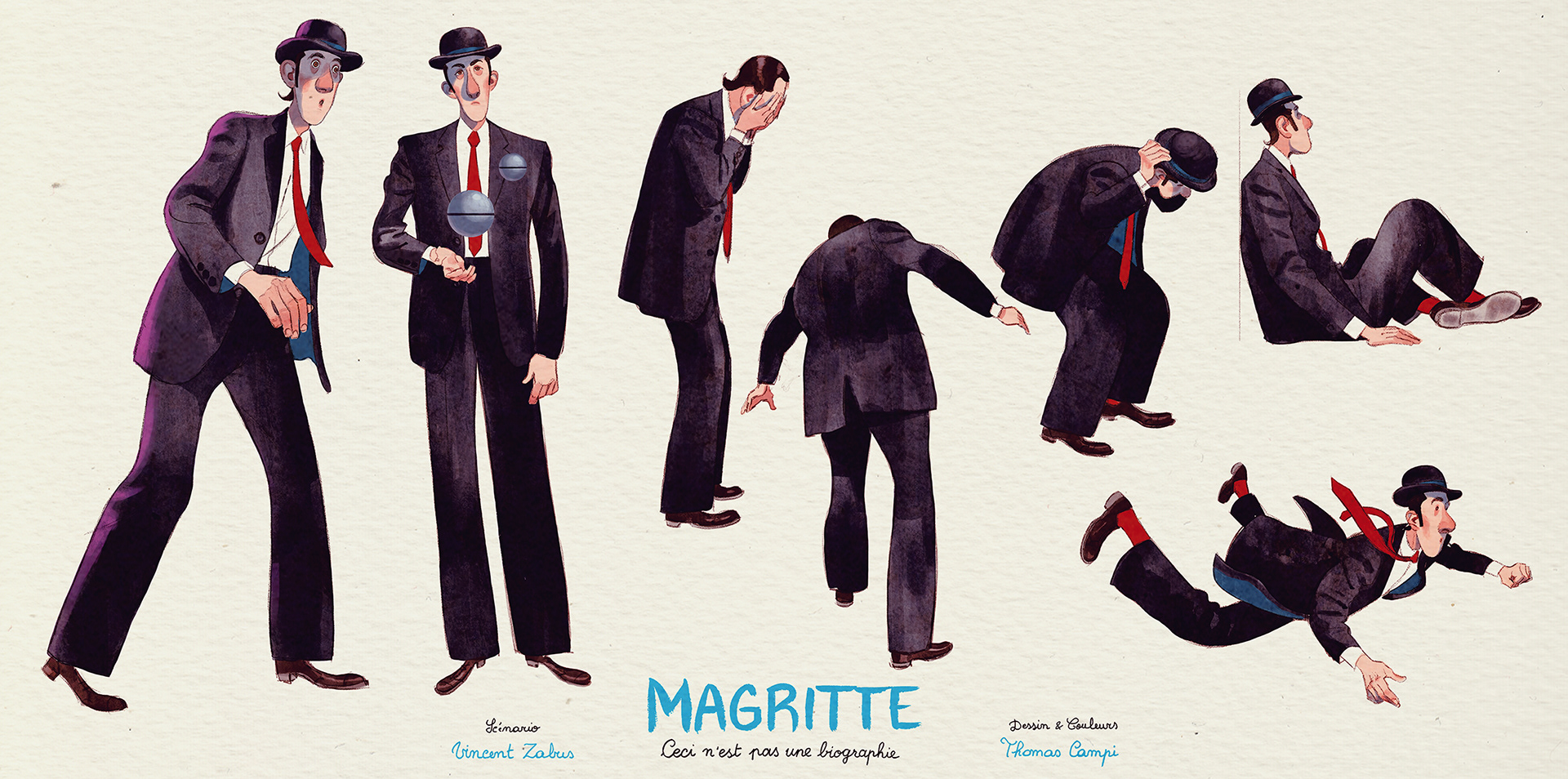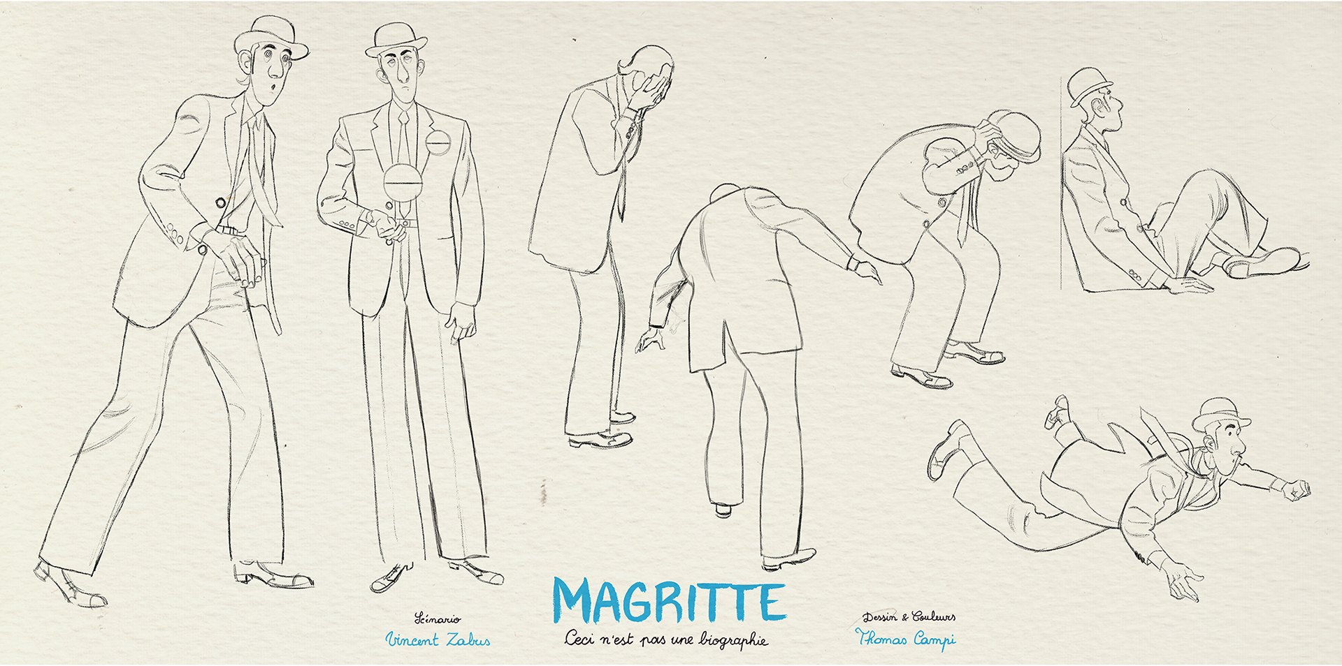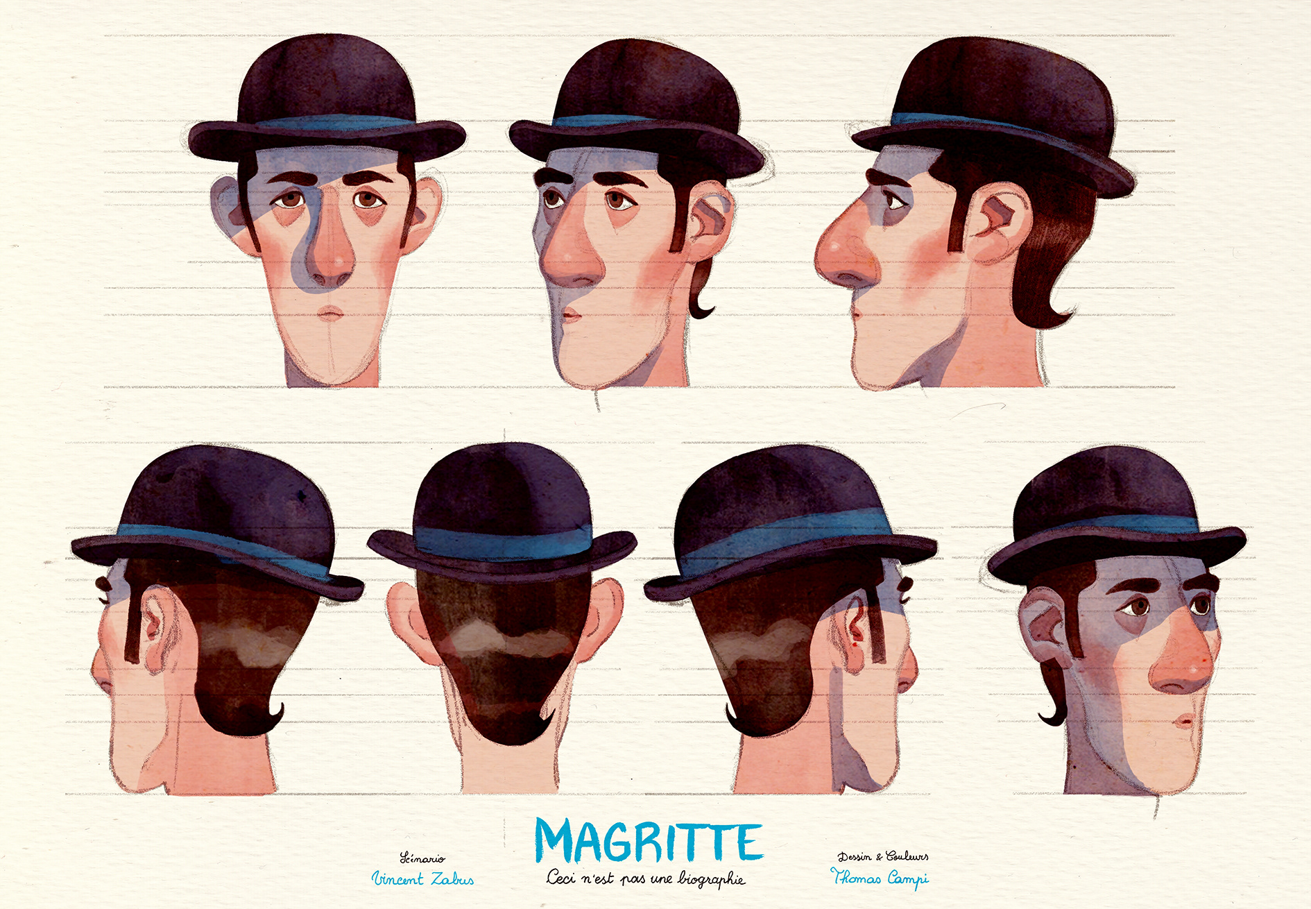 Character Design and poses for Charles, main character of the graphic novel "Magritte-This is not a biography" ( Selfmadehero ), and of a 3D short in pre-production.